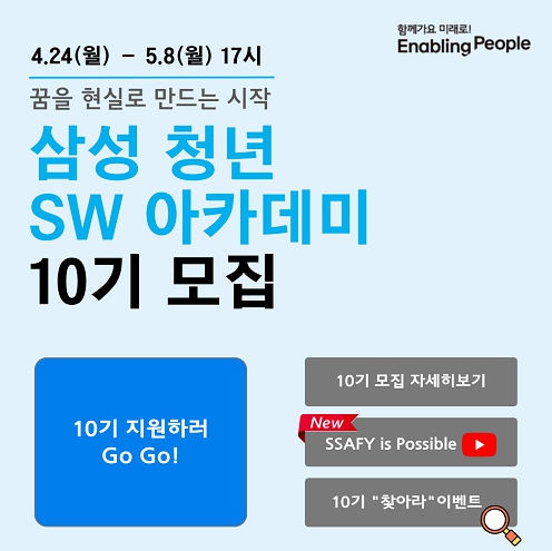 삼성 청년 SW 아카데미 SSAFY 10기 모집이 시작되었습니다. 취업 준비생을 위한 SW 역량 강화 교육 및 다양한 취업지원 서비스를 제공하는 SSAFY를 통해 취업에 성공할 수 있는 길을 마련하실 수 있는 좋은 기회가 될 수 있으니 지원 가능하신 분들은 아래 내용 확인하셔서 최고급 교육과 취업의 기회 한꺼번에 잡으시기 바랍니다.