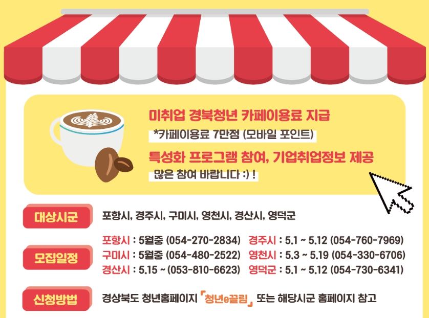 현재 경북청년 꿈이음 청춘카페 참여 시군은 포항시, 경주시, 구미시, 영천시, 경산시, 영덕군의 6곳입니다. 자세한 일정은 해당 시군 담당자에게 문의하시면 편리합니다.